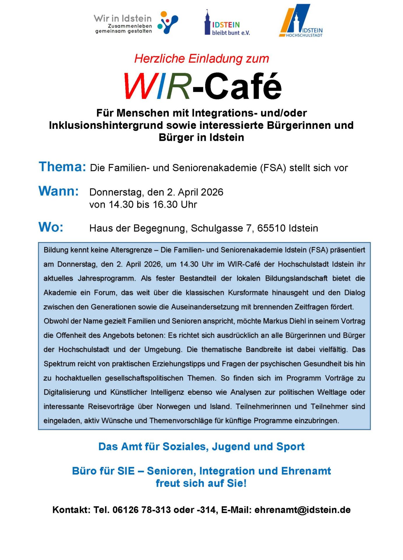 Bildung kennt keine Altersgrenze – Die Familien- und Seniorenakademie Idstein (FSA) präsentiert am Donnerstag, den 2. April 2026, um 14.30 Uhr im WIR-Café der Hochschulstadt Idstein ihr aktuelles Jahresprogramm. Als fester Bestandteil der lokalen Bildungslandschaft bietet die Akademie ein Forum, das weit über die klassischen Kursformate hinausgeht und den Dialog zwischen den Generationen sowie die Auseinandersetzung mit brennenden Zeitfragen fördert.