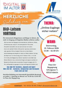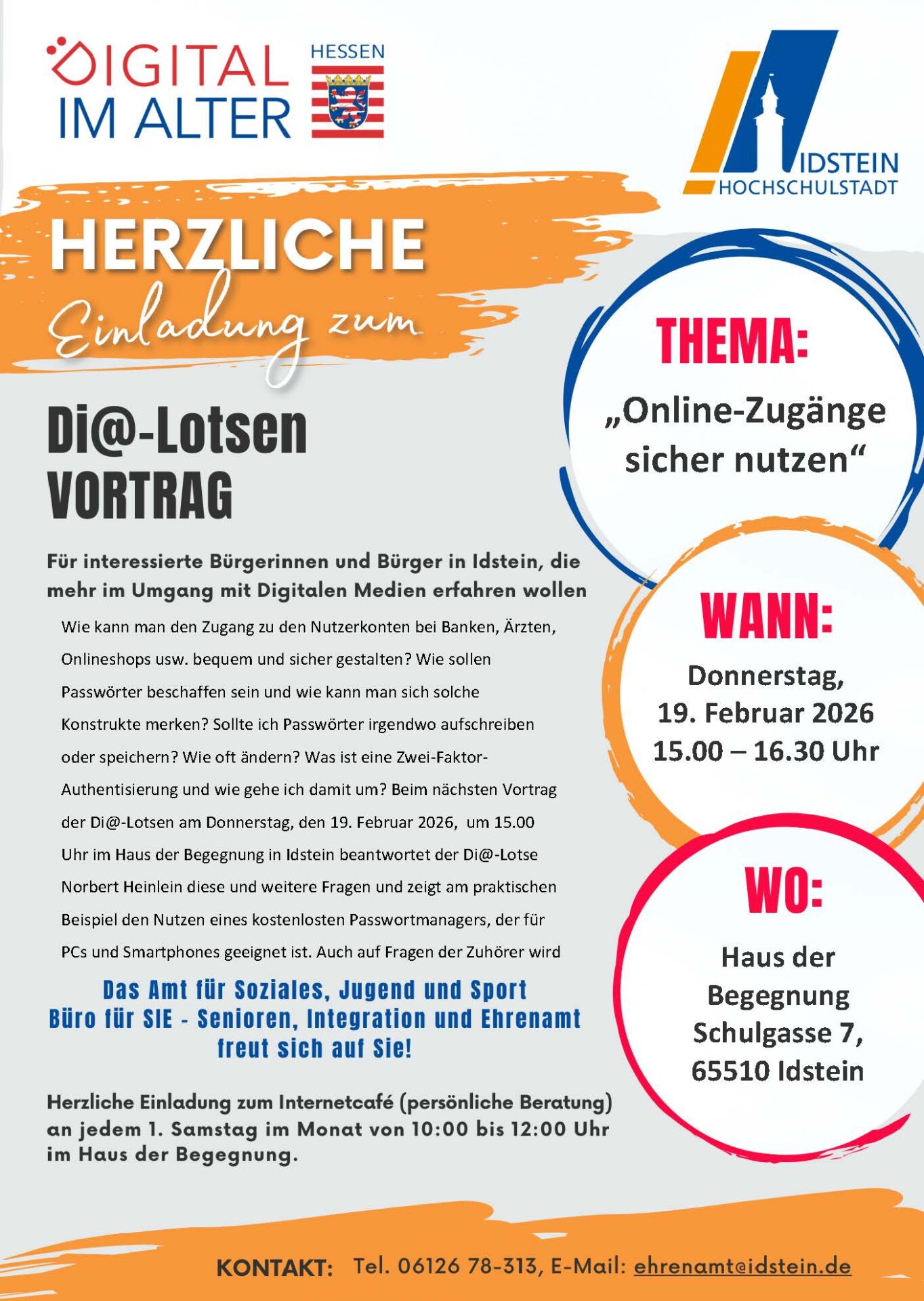 Wie kann man den Zugang zu den Nutzerkonten bei Banken, Ärzten, Onlineshops usw. bequem und sicher gestalten? Wie sollen Passwörter beschaffen sein und wie kann man sich solche Konstrukte merken? Sollte ich Passwörter irgendwo aufschreiben oder speichern? Wie oft ändern? Was ist eine Zwei-Faktor-Authentisierung und wie gehe ich damit um? Beim nächsten Vortrag der Di@-Lotsen am Donnerstag, den 19. Februar 2026, um 15.00 Uhr im Haus der Begegnung in Idstein beantwortet der Di@-Lotse Norbert Heinlein diese und weitere Fragen und zeigt am praktischen Beispiel den Nutzen eines kostenlosten Passwortmanagers, der für PCs und Smartphones geeignet ist. Auch auf Fragen der Zuhörer wird eingegangen. Das Angebot ist kostenlos, eine Anmeldung nicht erforderlich.