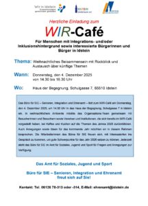 Das Büro für SIE – Senioren, Integration und Ehrenamt – lädt zum WIR-Café am Donnerstag, den 4. Dezember 2025, um 14.30 Uhr in das Haus der Begegnung, Schulgasse 7 in Idstein ein. In weihnachtlichem Ambiente möchte das Organisations-Team gemeinsam mit Besucherinnen und Besuchern sowie Vereinen und Institutionen, die sich bereits im WIR-Café vorgestellt haben, bei Kaffee und Kuchen auf die Themen des Jahres 2025 zurückblicken. Auch Anregungen sowie Ideen für das kommende Jahr möchten wir in diesem Rahmen besprechen. Die Mitarbeiterinnen des Büros für SIE freuen sich, mit Interessierten ins Gespräch zu kommen, um gute Schwerpunkte für das Jahr 2026 setzen zu können. Jederzeit steht das Büro für SIE im Amt für Soziales, Jugend und Sport für Fragen und Anregungen zur Verfügung.